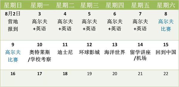 (备注:对于选择2周或多周都是高尔夫培训学生,周六和周日都将参加学校组织的活动或比赛)